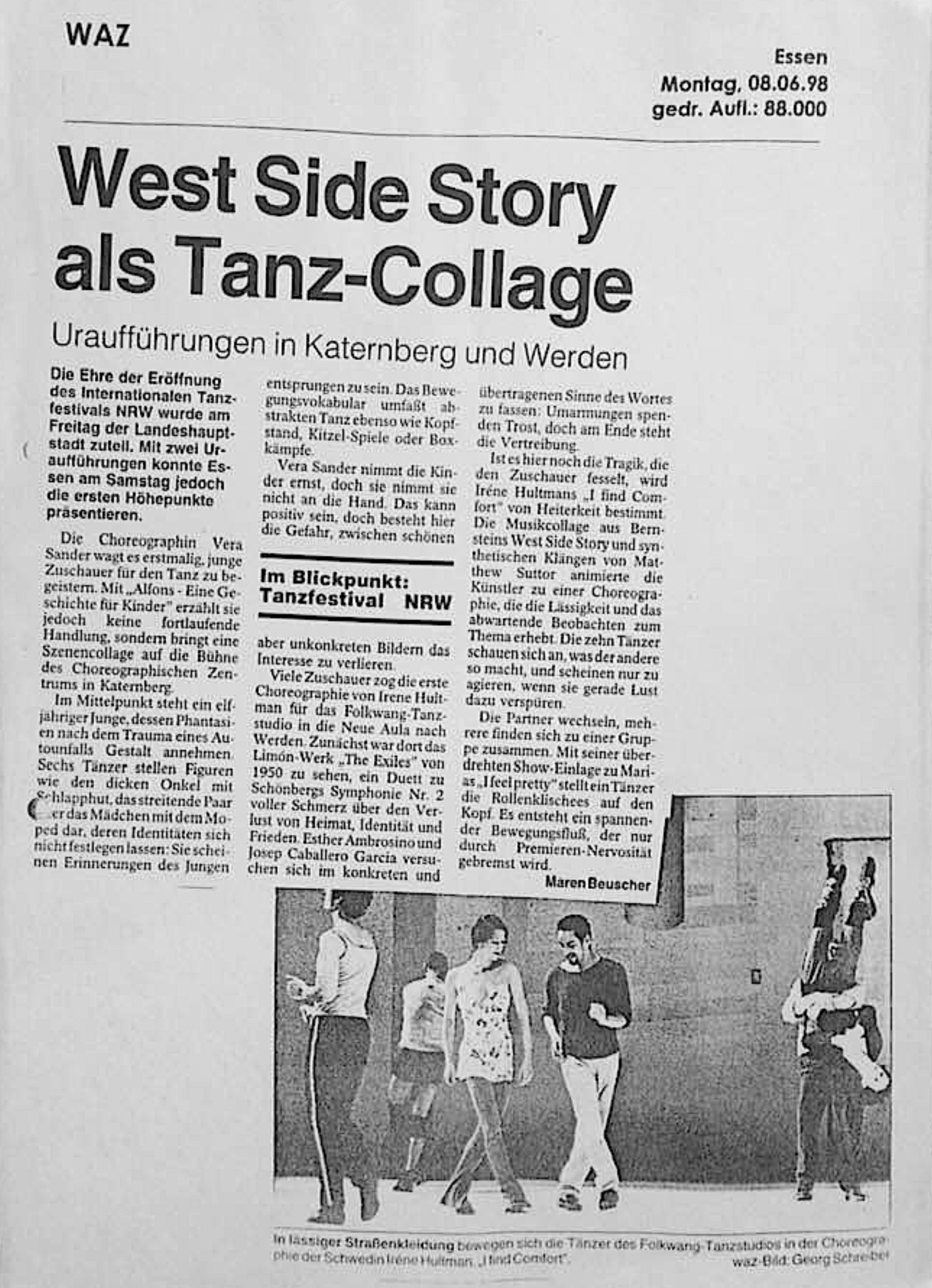 ,“1 find comfort“ ist zunächst einm al einfach ein Treffen zwi schen den Tänzern des Folkwang Tanzstudios in Essen und mir selbst: In vier Wochen haben wir eine „Welt von Bewegungsmosaiken geschaffen, in denen Spaß und Freude eine zentrale Rolle spielen.